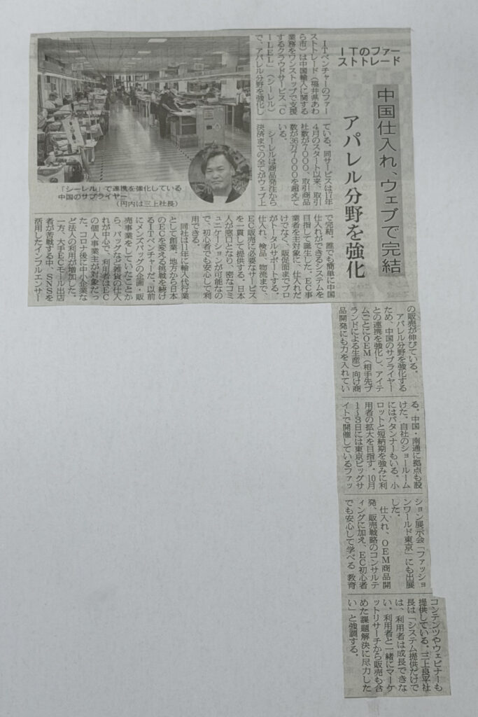 記事では、当社が展開するサービス「CiLEL(シーレル)」を通じて、中国のサプライヤーとの連携を活かした“小ロット・短納期”でのOEM生産など、アパレル分野における支援体制の強化について紹介されています。